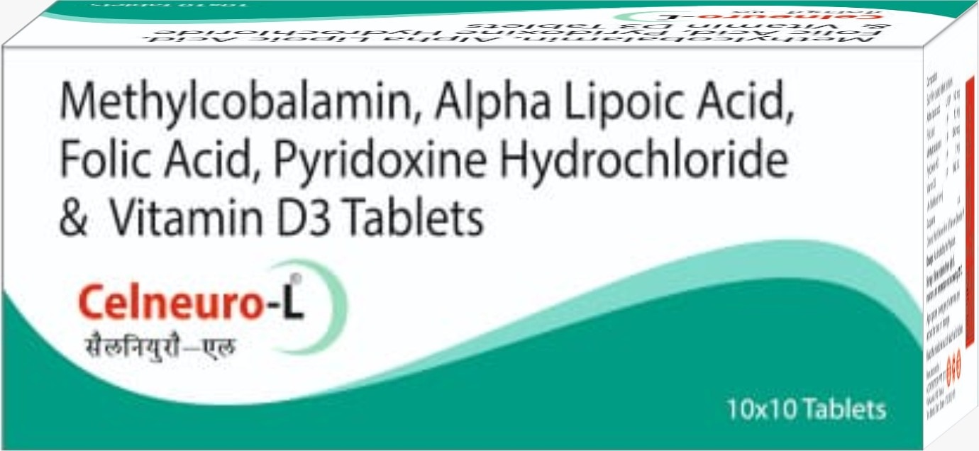 Product Name : CELNEURO-L Pruduct Description : Methylcobalamin 1500 MCG + alpha lipoic acid 100 mg + folic acid 1.5 mg + vitamin B1 10 mg + vitamin B6 3 mg capsule PACKING : 10 Tablets Classification : Peripheral Neuropathy,homocysteinemia,Post Traumatic Neuropathy,Diabetic Neuropathy Form : Tablets Uses : Nerve Rejuvenators